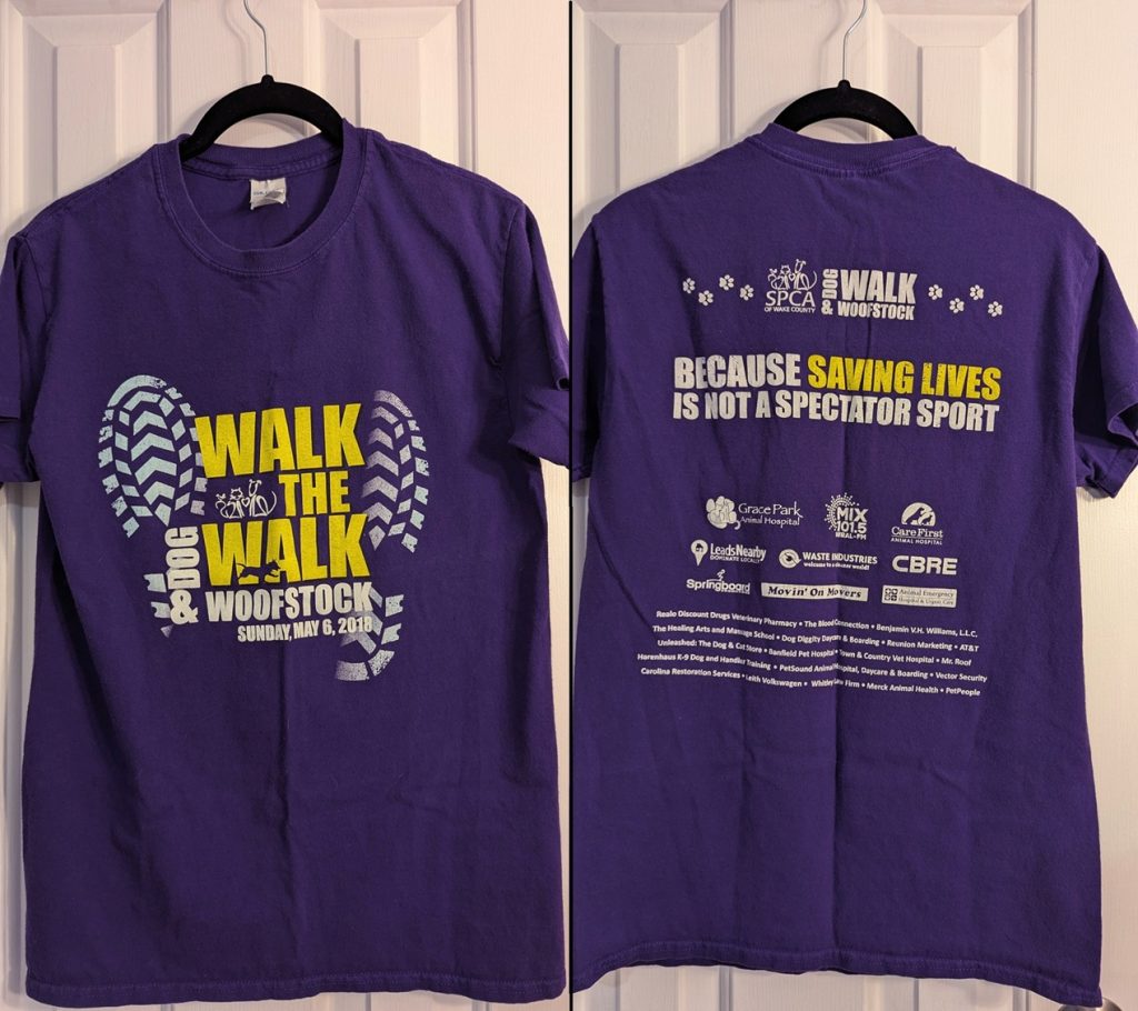 This was designed as a participant t-shirt for a dog-friendly fundraising walk. I incorporated the year’s theme “Walk the Walk” (in yellow) with the Dog Walk & Woofstock logo (white and second yellow “Walk”).